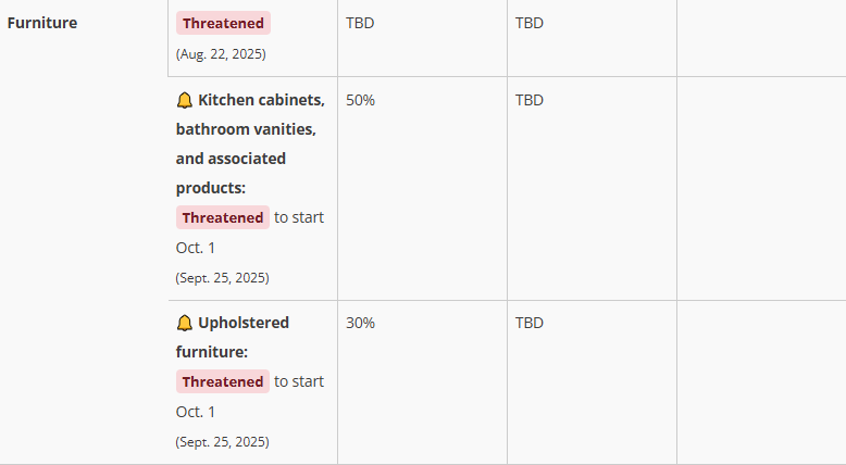 自10月1日起★ღ◈ღღ,美国将对进口的所有品牌或专利药品征收100%关税★ღ◈ღღ;对所有厨房橱柜★ღ◈ღღ、浴室柜及相关产品征收50%关税★ღ◈ღღ、软体家具征收30%关税★ღ◈ღღ;对在美国境外生产的重型卡车征收25%关税★ღ◈ღღ。